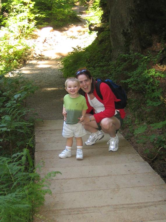On a hike to Franklin Falls off I-90, the Denny Creek area. Kenny did very well, and walked all the way in. Our hikes are definately much less ambitious than pre-kids.