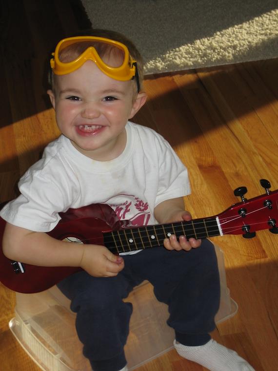 This is a classic...Kenny is almost always accompanied by his toy guitar, and his toy safety goggles, that he puts on his head. The guitar I understand, the safety goggles - not really. But he loves them.