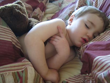 | | Kenny asleep in our bed. Cute picture, but this was the beginning of short virus, with a high fever |