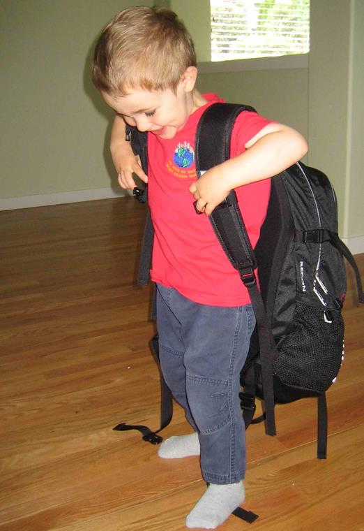 On our way to Whidbey Island with the Lucases - Kenny tries on my backpack