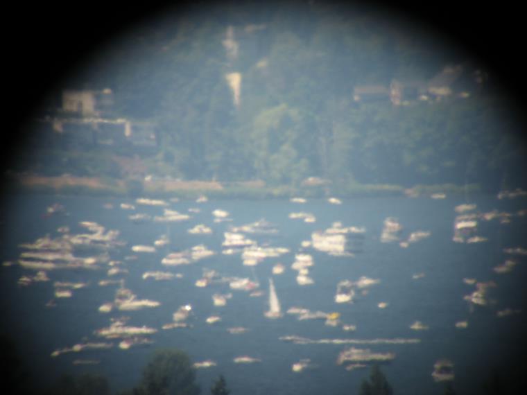 When the Blue Angels are flying, the boats jostle for the best spots right underneath their flight path. This is a picture through the telescope.