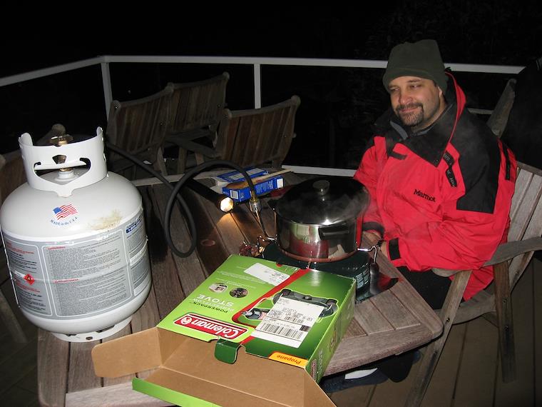 Cooking macaroni and cheese outside using a burner and the propane tank from our grill.