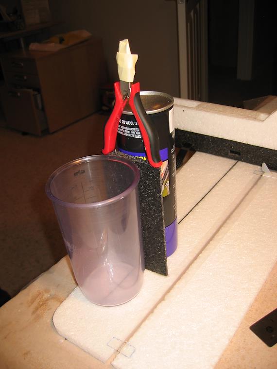 The the support is glued to the bottom wing. I use a spray can to make sure that it is vertical and a pliers to weigh it down while the epoxy sets. Repeat on the other side :-)