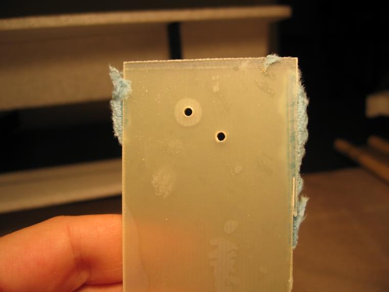 Here is a test piece. Notice the lighter part around the left hole. This was caused by drilling too quickly. The drill bit torqued the local area around the hole and separated the two epoxied pieces.