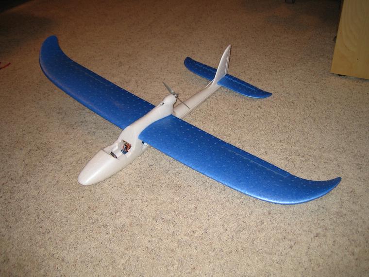 The completed plane. Next I need to test it. I found that even with a 2100 battery, the center of gravity was well back of where it should be. This is good, as I will be adding quite a bit of weight to the front of the plane.