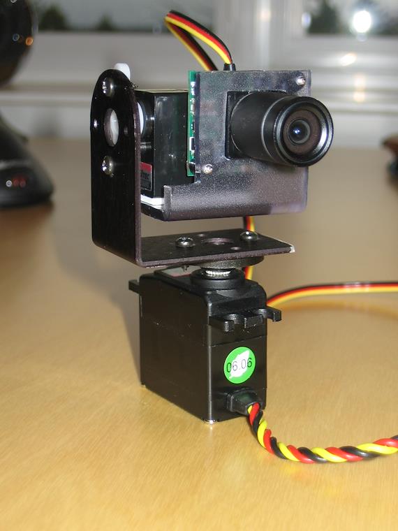 Eric attempts to fly, sort of. Eric builds a camera and video transmitter into an RC plane. Here's the complete mount. I used an HS-5245MG digital servo for the pan. This servo can be programmed to move through 180 degrees or more of motion and seems to be fairly tough.