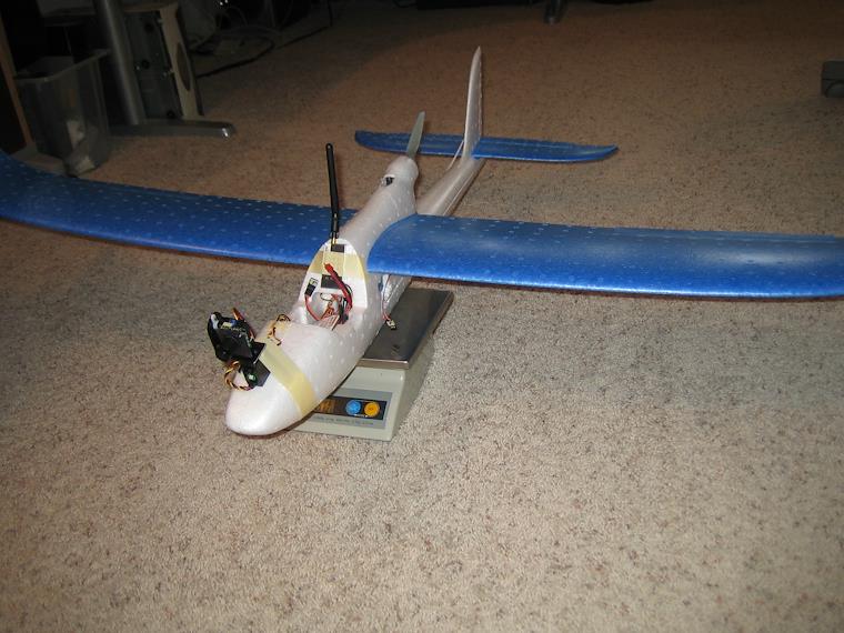 Here I load up the Easystar with all the components with which I expect to fly. With battery, it weights 760 grams. Note that I intend to mount the camera pretty far forward. All seems to balance well.