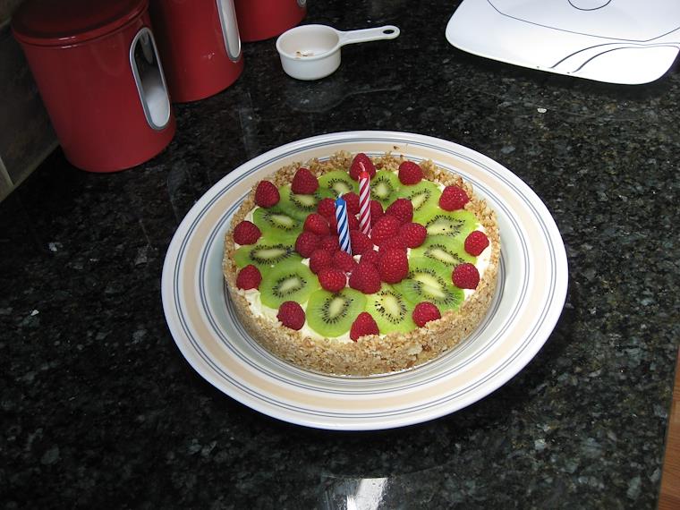 Peter's second birthday! We made a fruit tart type of cake, with berries and kiwis on top.