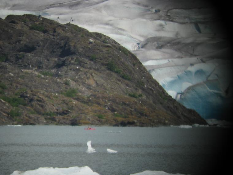 Close-up through the binoculars - someone in a kayak on the glacial lake