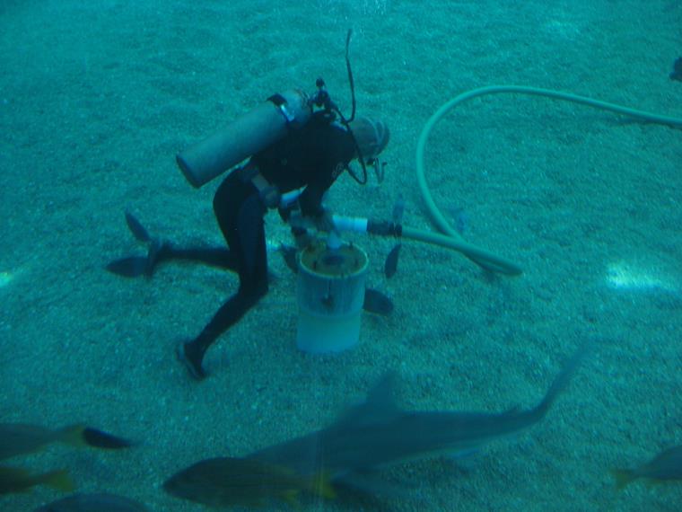 I think this diver is cleaning the fish poop from the sand.