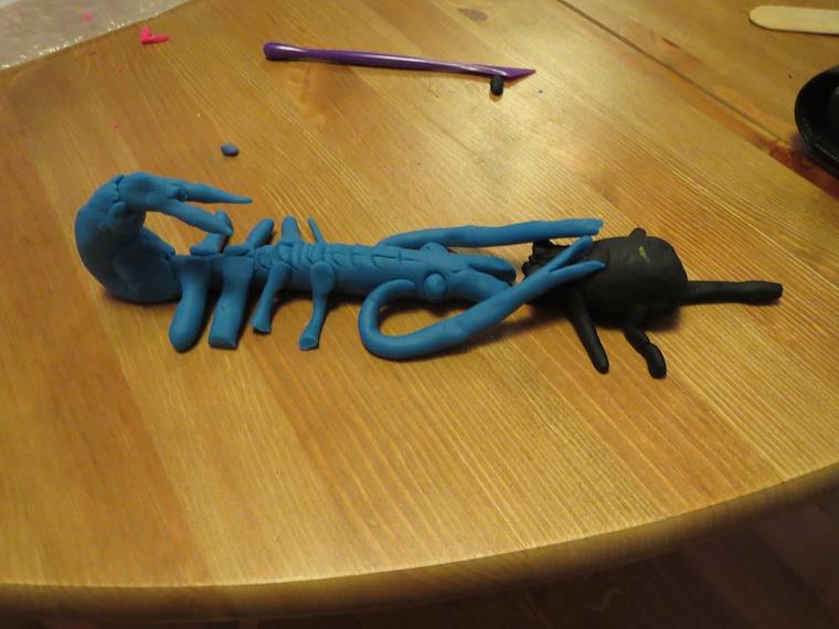 Our babysitter Kim did some very detailed playdough with the kids! Looks like a lobster eating a rat