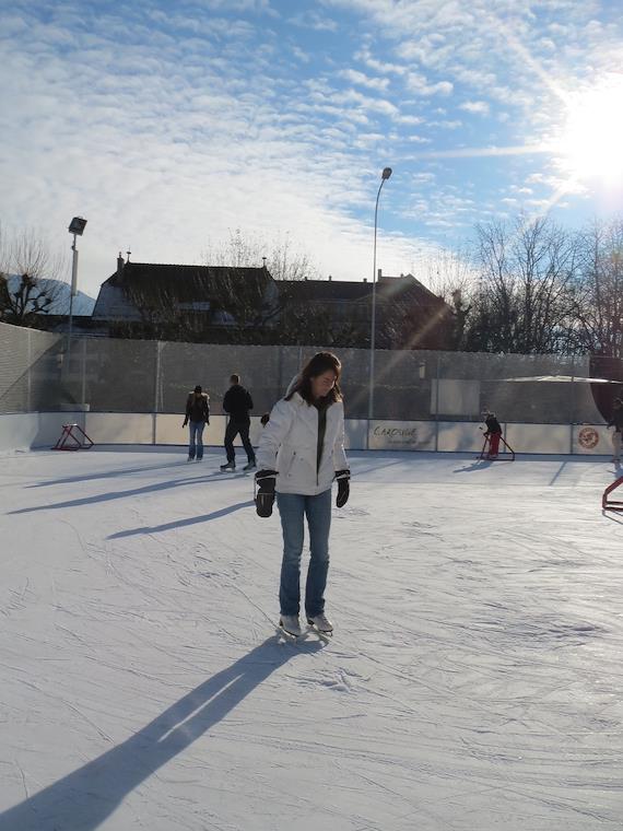 Ice skating in Carouge. Both the ice skating rink and skate rental were free! Peter learned a lot.