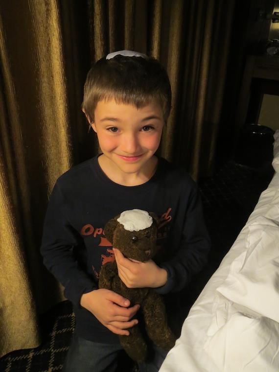 Kenny made himself and his teddy some yarmukes from some tissue at our hotel