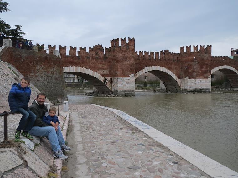 Walking towards the old city along the river Adige. In the background is the Castelvecchio Bridge