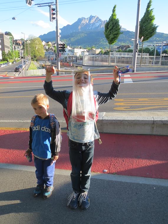 Walking to our hotel, with some chocolate milk containers that I bought so the kids could get the Migros promotional tops, which were all the rage at the school.