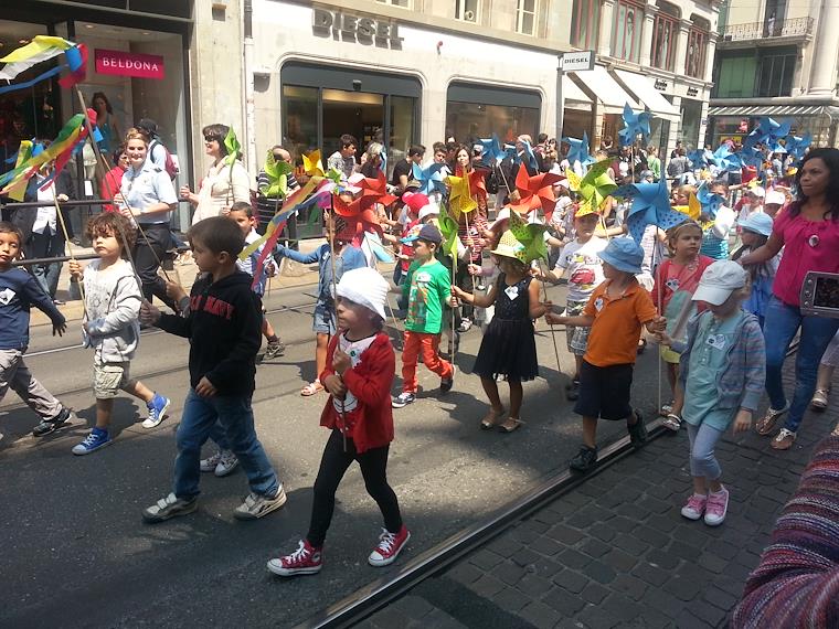 End of school concert and parade, kids visit UN, Peter's sixth birthday, visiting the Oujon ruins, and walking along Lake Geneva from Morge to Saint Sulpice.