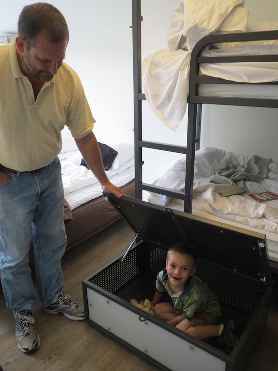 Our room at the Generator Hostel had interesting slide-out lockers under the bunk beds