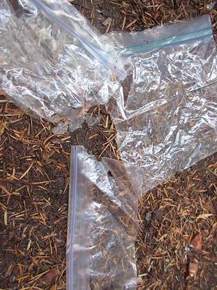 Disaster - turns out that we needed to protect the food from squirrels just as much as from bears. Notice all the gnawed holes in my empty food bags! Good thing I had extra.