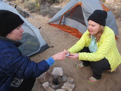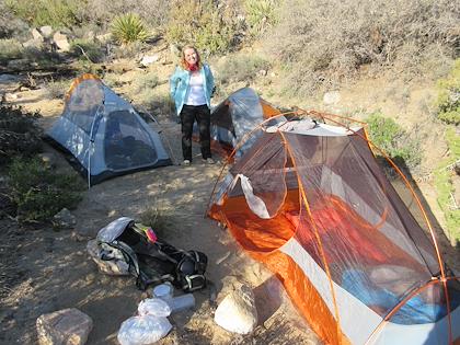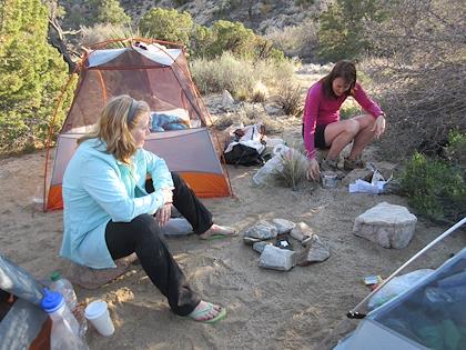 |  | |  | | Our first campsite. Kelly and I didn't bring our rain covers, since we'd be warm enough, and wanted to see the stars. | |