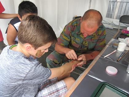 |  | |  | | Finding mines | | Peter gets a fake wound painted on his arm. The look of it creeped him out, and bothered him so much that he rubbed it off soon after, to the dismay of some on-lookers who thought we were washing off a real wound. |