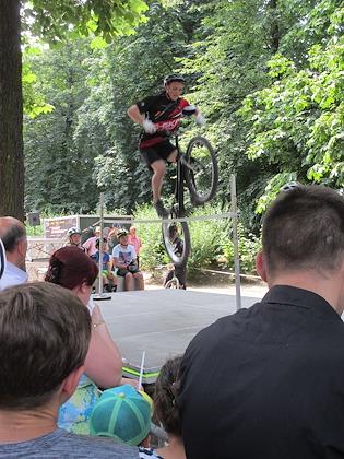 |  | |  | | A mountain bike jumping competition in Brussels Park | | There were big bins of free plastic water bags - easier than setting up fountains? Hard to drink from, though. |