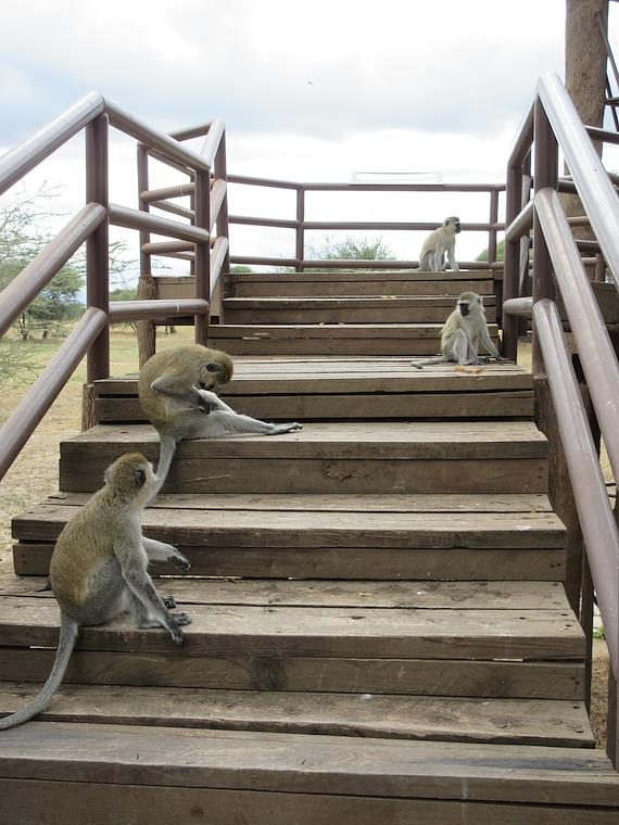 An elevated platform at the entrance to the park - monkeys everywhere!