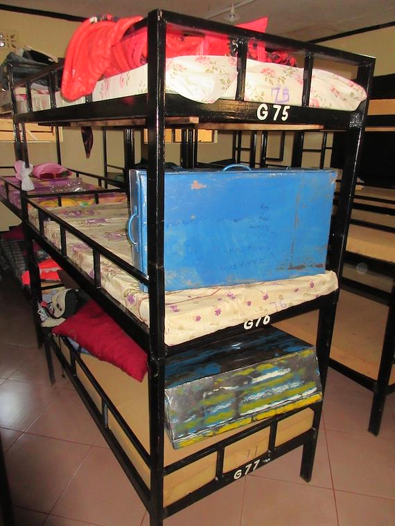 Triple decker bunks in the dormitories. The students had just come back from vacation, so things were still in disarray