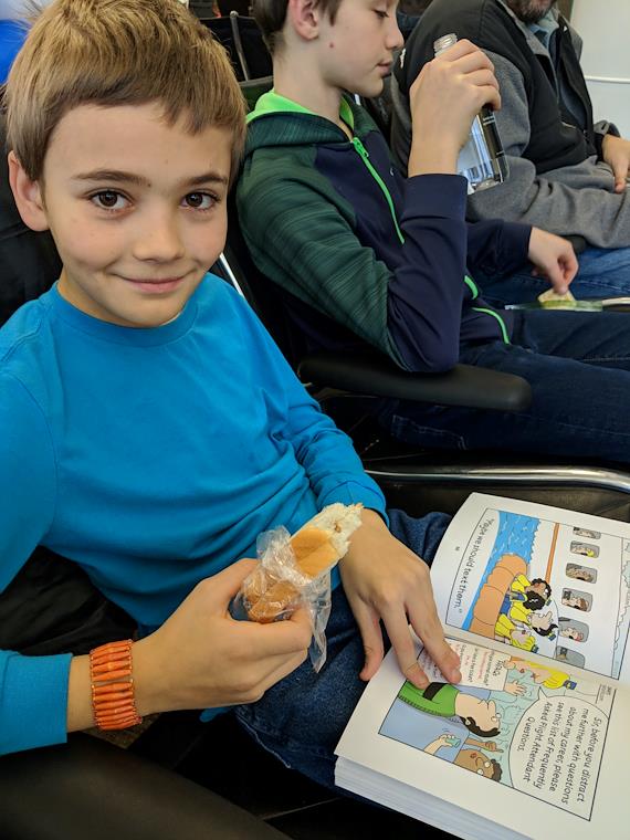 On the flight - Peter reading Kelly's book