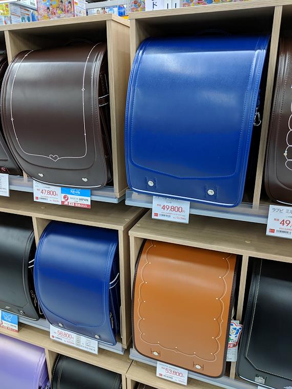 Super expensive Japanese children's backpacks. The most expensive one here is about 538 USD. We later saw ones that were even more expensive.