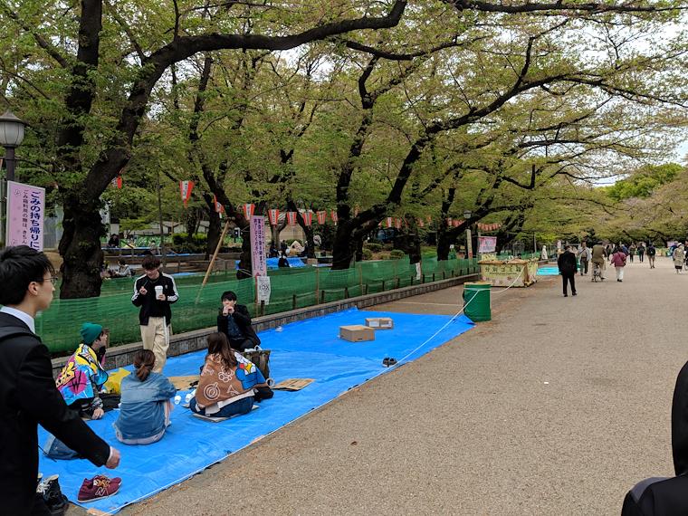Ueno Park was a big cherry blossum viewing area. There were large blue plastic sheets set up for people to set up picnics on, along with signs telling them to stay only one hour
