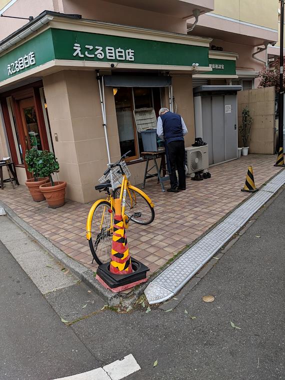 It's more interesting to walk down the street in Japan because things actually happen and are visible on the street. This man has a street-side shoe polishing stand.