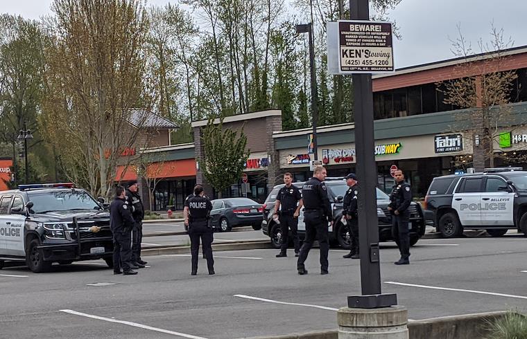 Police at the Starbucks parking lot, 148th and Main. "Social distancing"