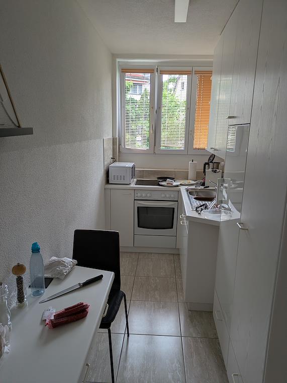 The apartment kitchen. Pretty well laid out, except for the drawers under the table, which constrained your legs.