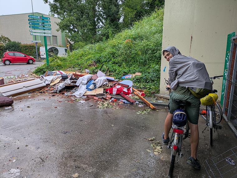 Caught in a cloudburst! It was raining so heavily that I couldn't even blink fast enough to keep the rain out of my eyes. We hung out under this bridge, along with a lot of garbage.