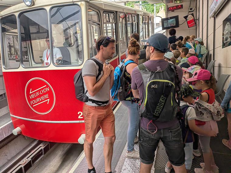On the funincular up to the Fourvière Basilica. Peter remembered this from our visit when he was younger.