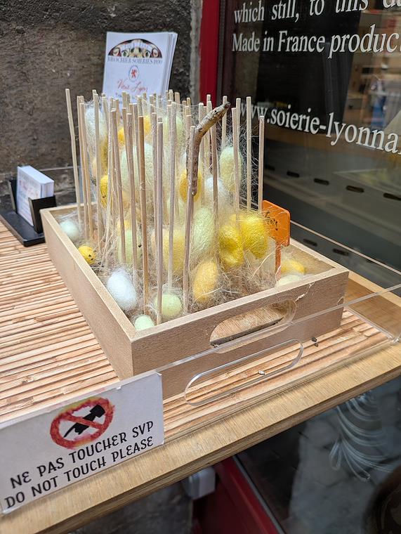 This is a demonstration of silkwork cultivation - the little balls are cocoons. Silk scarves are a specialty of Lyon.