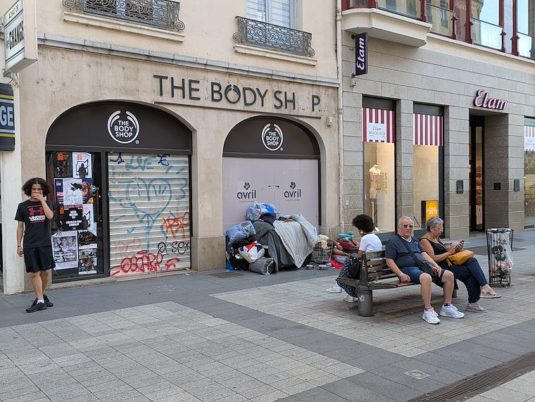 Quite the extremes here - a Body Shop store, with a homeless guy camped out in front, and a bunch of grafitti. And this was on the main shopping street, too. Granted, it was the only setup like this that I saw.