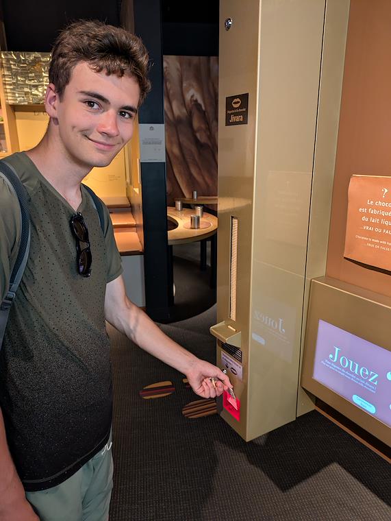At the chocolate museum, they had tickets with a QR code. Scan the QR code at one of a number of machines, and you get a free chocolate. Peter got double-chocolates.