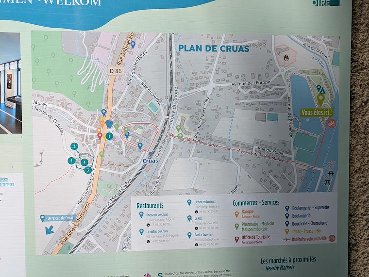 This is the map of Cruas that was in the campground office. It shows multiple restaurants and other businesses. But it seems like they've all gone out of business. The tourist office was open, though.