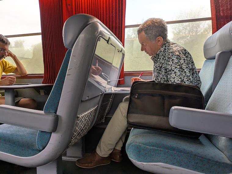 I had to take a photo of this guy, working. He was doing paperwork, annotating forms, highlighting things, etc. It just struck me that I haven't seen anybody in the US work through paper forms like this for a long time now.