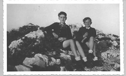 | 1945 My father, with his godmother when he was being confirmed | | 1947? My father with his good friend Stockinger, next to a shelter on top of some mountain (Gimonihuette?) |