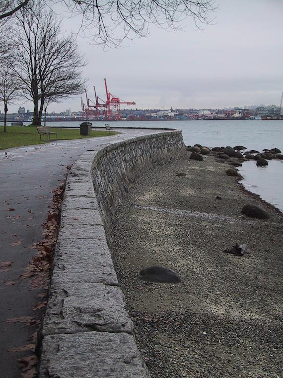 In the distance, the freight cranes of North Vancouver.