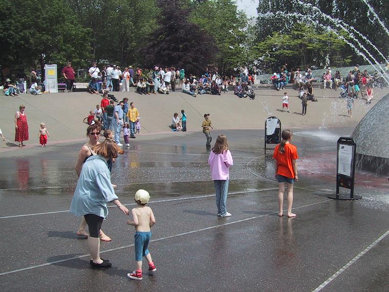 The central fountain shoots off water in a somewhat random pattern designed to get you to try to time it so you can run in, touch the fountain, and run away without getting wet.