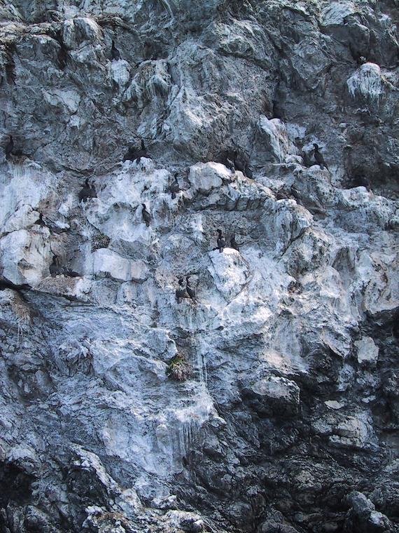 A colony of nesting birds. It really stunk around there! The white on the rocks is all bird droppings.