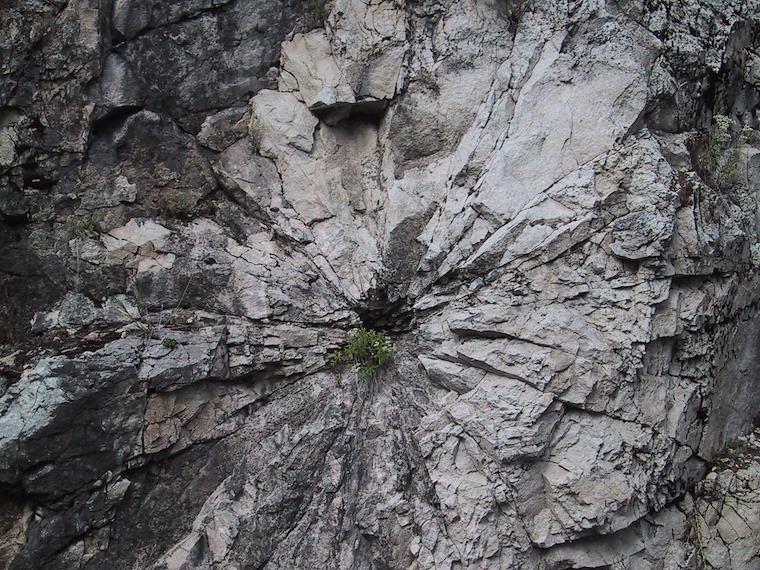 We saw this strange rock formation as we were driving away from Paradise. The most likely cause would have been dynamiting away rock for the road, but I'd never seen that before. However, after posting a question on a geology newsgroup, the consensus was that that was exactly what had caused it.