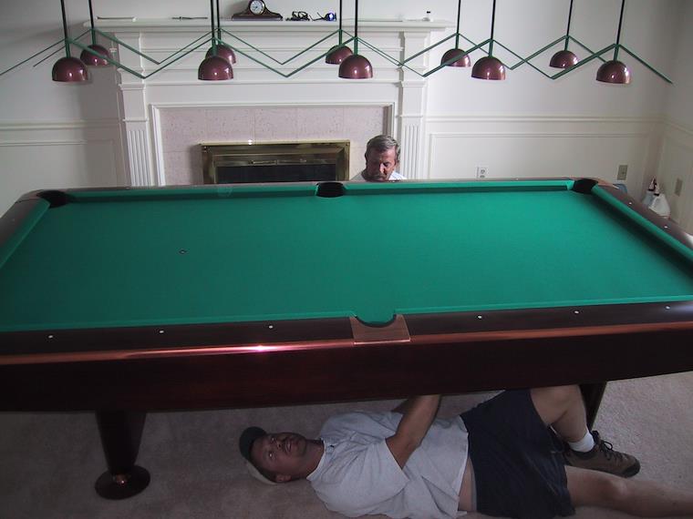 Mike from Portland (in the foreground) bought the pool table on Ebay. His alias on Ebay was "PoolGod". Needless to say he is very much into pool, already has one pool table, and apparently has a t-shirt that says something like "Pool is Life, the rest is all details".
