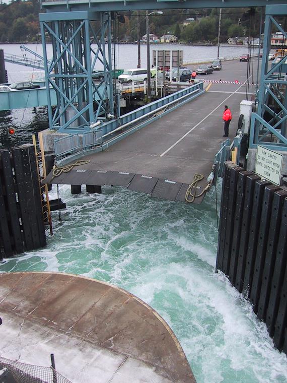 When the ferry docks, they reverse engines to slow down. Really churns up the water.