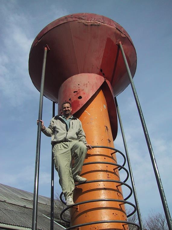 Eric climbing on some old machinery.