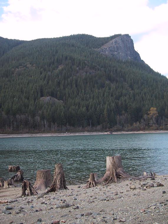 The old town of Moncton lies beneath these waters. It was a logging/railroad town that was submerged by water leaking from a damned up lake uphill.