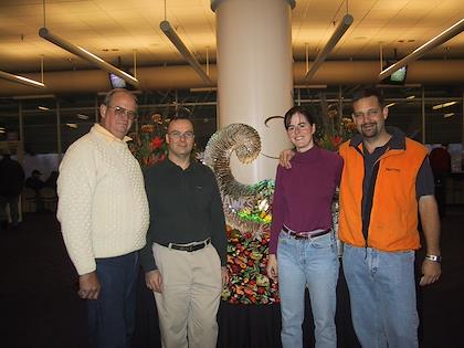 From the left, Charles (the father of a friend of Dinarte's), Dinarte, me, and Eric. The ice sculpture in the middle says "Go Hawks".